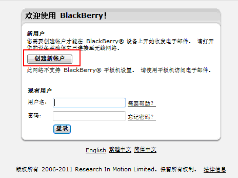 2、 开通BIS业务后,请使用电脑登录www.chinamobile.blackberry.com,进入下图界面,单击创建新帐户 。