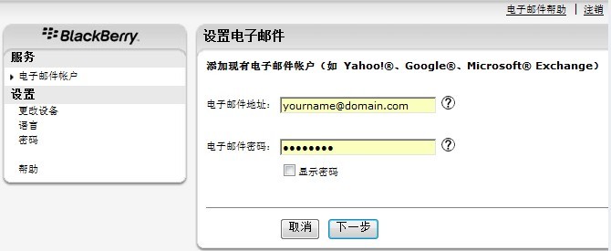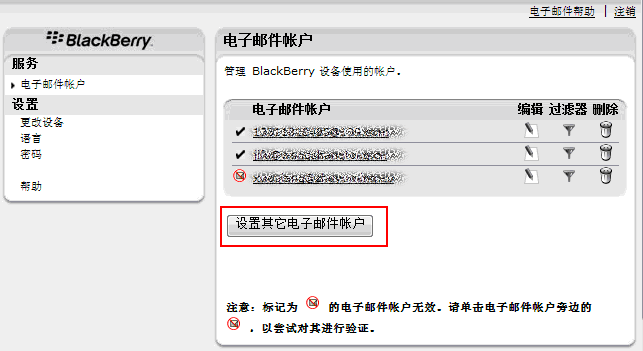 注:每添加一个邮箱账号,您的黑莓手机主屏都将多一个邮箱账号图标。目前中国移动BIS业务最多可以添加10个邮箱账号。
